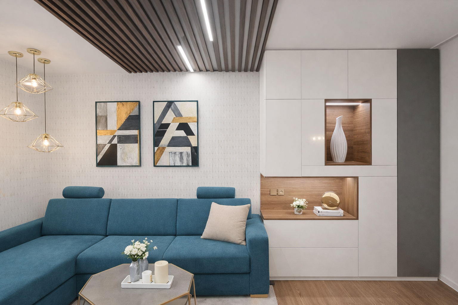 Dominantou obývacího pokoje je rozkládací sedací souprava, která poskytuje dostatek prostoru pro rodinný odpočinek i každodenní spaní. Volba kvalitní sedačky s plnohodnotnou spací plochou umožňuje zachovat funkci obývacího pokoje a zároveň nabídnout komfort ložnice. Výrazná modrá barva sedačky dodává interiéru energii a stává se přirozeným centrem prostoru.